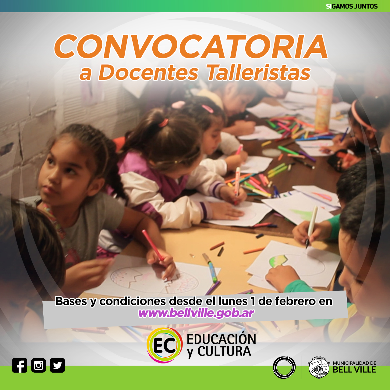 Se recuerda que en la página web de la Municipalidad (bellville.gob.ar) botón Convocatoria a Talleristas, se publican las bases para la presentación de los referidos proyectos.