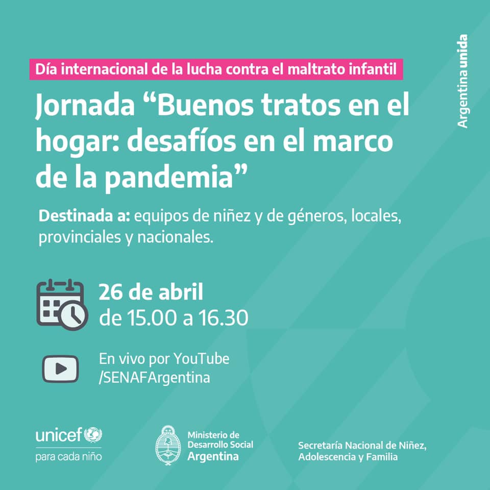 El próximo lunes, la Secretaría Nacional de Niñez, Adolescencia y Familia, del Ministerio de Desarrollo Social de la Nación, realizará junto a UNICEF Argentina una Jornada de “Buenos tratos en el hogar: desafíos en el marco de la pandemia” a raíz del Día internacional de la lucha contra maltrato infantil.