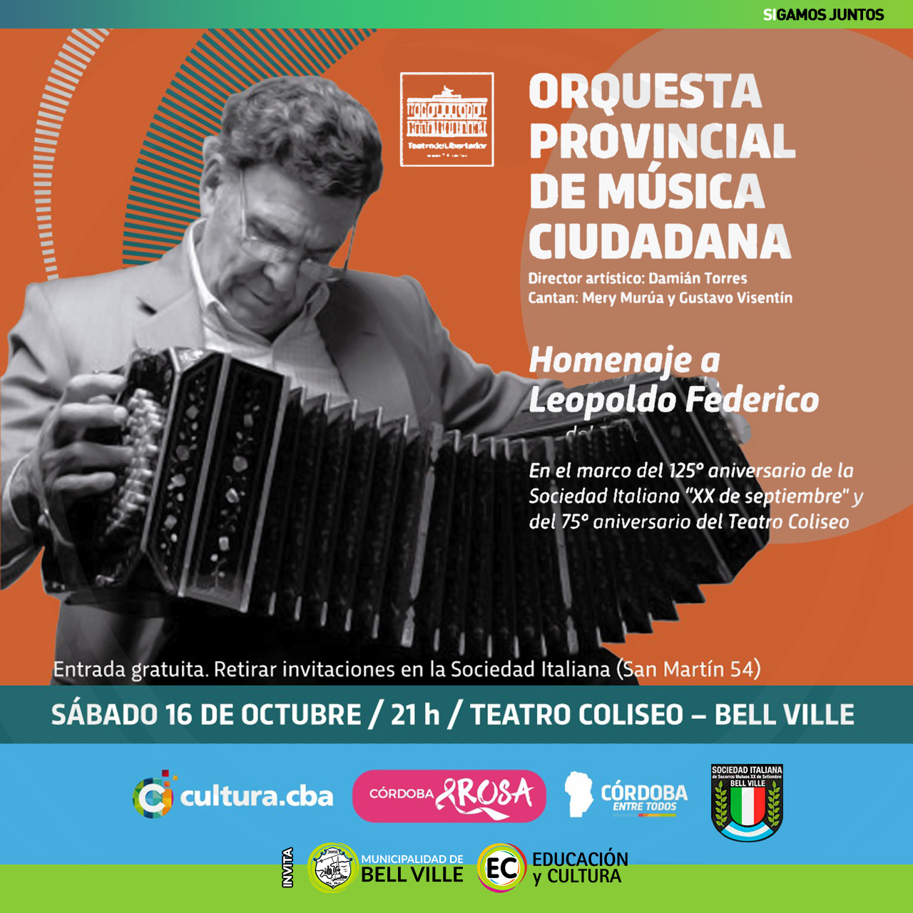 El presidente de la entidad organizadora, Luis Giletta, anunció la presentación de la Orquesta Provincial de Música Ciudadana, este sábado a partir de las 21:00 en el Teatro Coliseo, con entrada gratuita, debiendo retirar las invitaciones en la Secretaría de la Sociedad Italiana, San Martín 54.