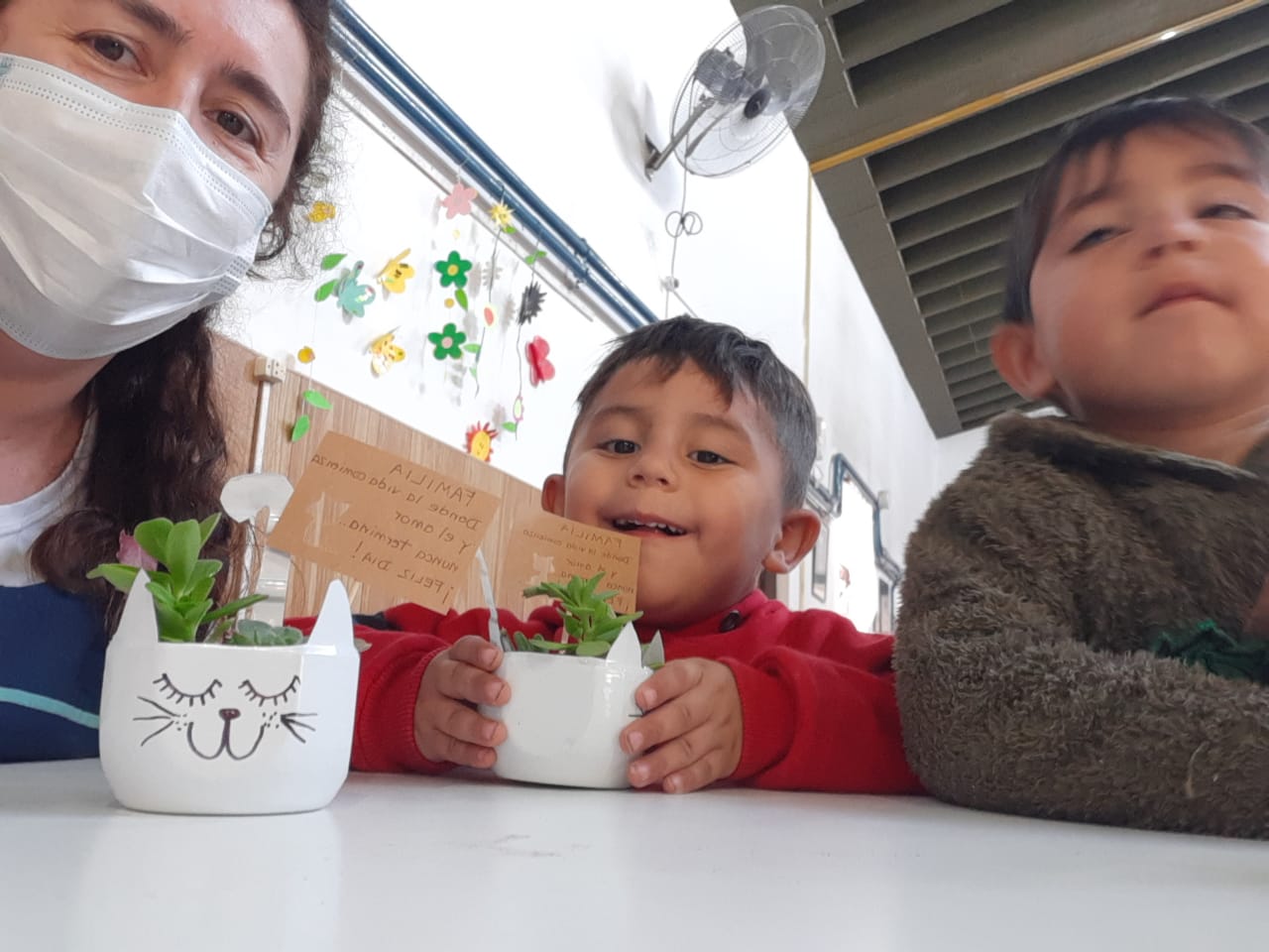 Los pequeños, con ayuda de las docentes, reciclaron botellas plásticas, transformándolas en masetas con diversas plantas que representan el amor que cada uno de ellos siente por su familia.