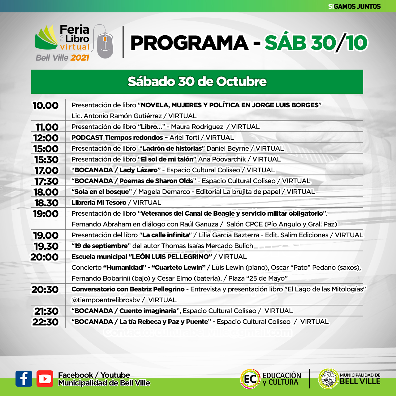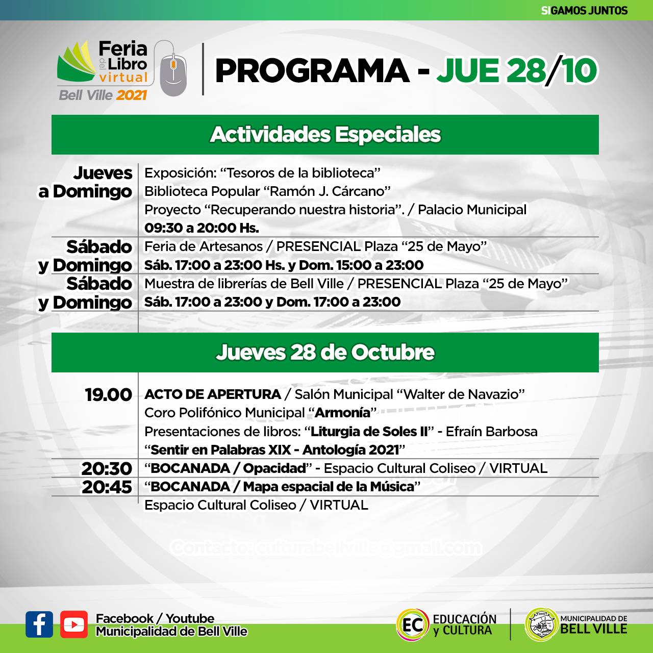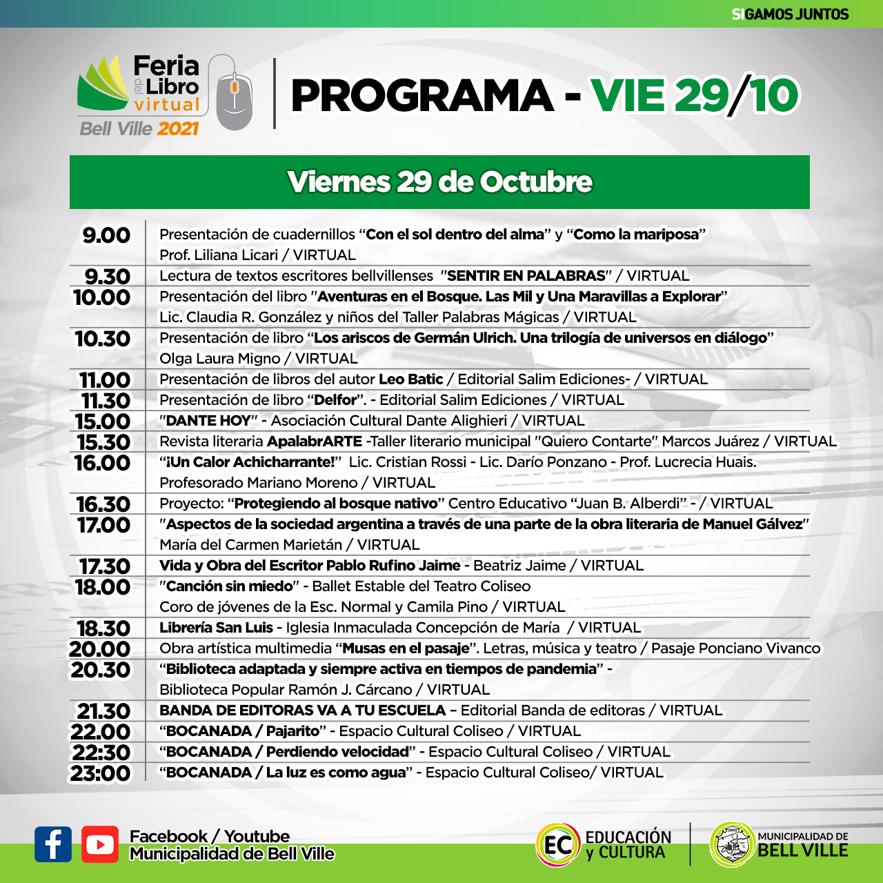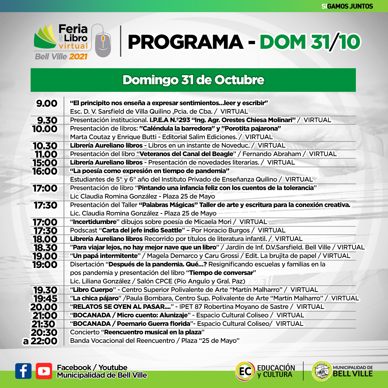 En su dimensión virtual, la feria incluye alrededor de 50 presentaciones y charlas, que serán emitidas a través de los canales de la Municipalidad, redes sociales, sitio web y YouTube. Toda la programación es comunicada en el sitio web municipal (https://bellville.gob.ar/- Botón Feria del Libro Virtual-Bell Ville 2021). Las diferentes propuestas literarias y culturales podrán ser vistas en el momento que el interesado lo disponga y la programación quedará disponible allí por más de 30 días.