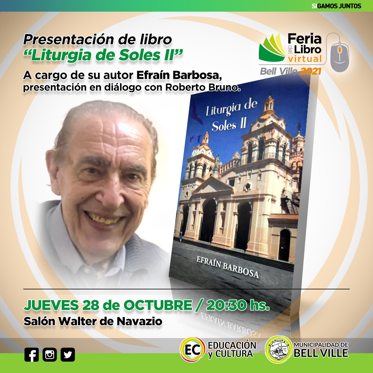 Posteriormente, el Coro Municipal Armonía, bajo la dirección del Prof. César Vasconi, interpretará obras del repertorio popular y finalmente Efraín Barbosa presentará su libro “Liturgia de Soles N*2”, con el acompañamiento del narrador también bellvillense, Roberto Bruno.