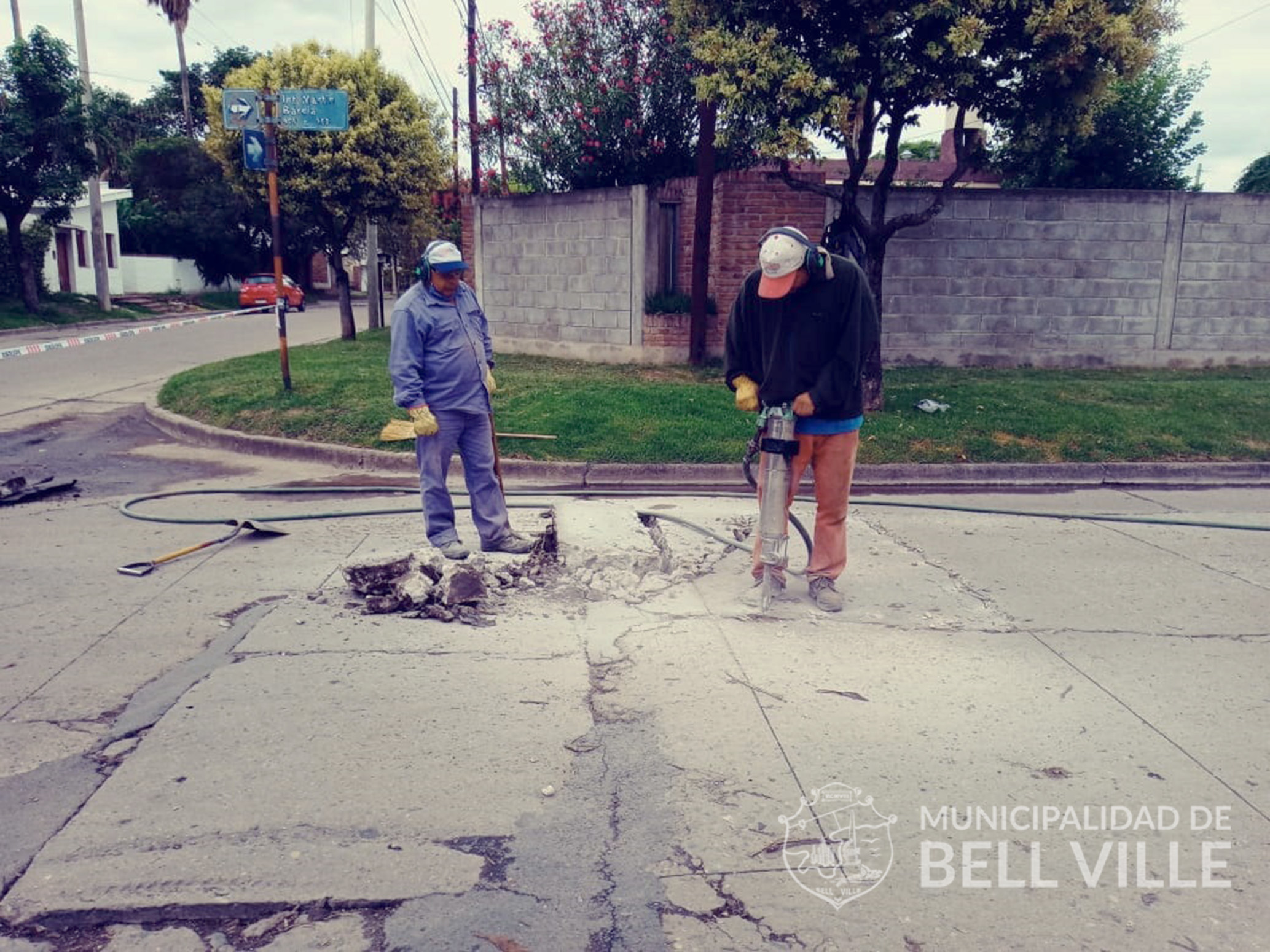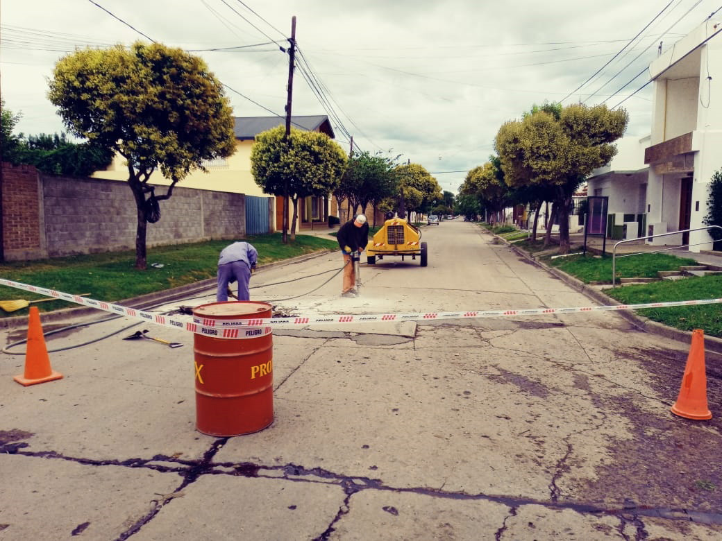 En la esquina de calles Barcia y Leonelli, se trabaja en la solución de un sector de hormigón seriamente dañado.