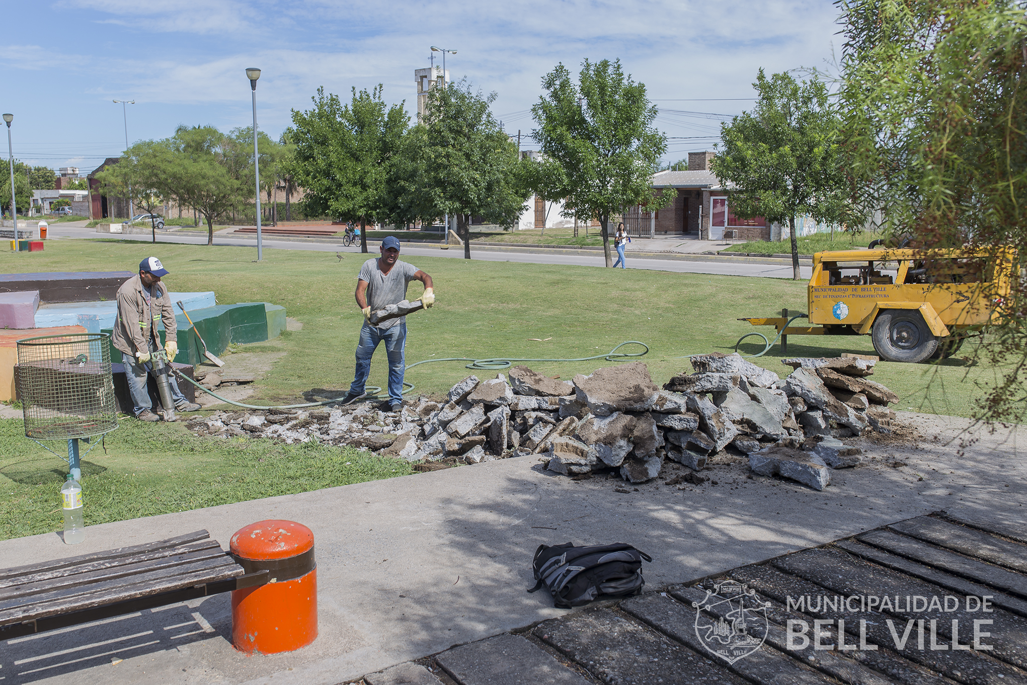 Personal municipal trabaja en la reconstrucción de veredas que unen los distintos juegos y espacios temáticos distribuidos en la plaza.