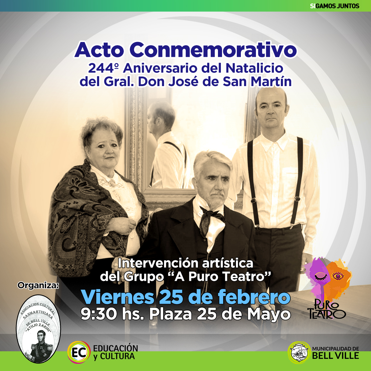 Luego del acto protocolar organizado junto a la Municipalidad, el grupo A Puro Teatro, bajo la dirección de la Prof. Silvia Rodríguez, presentarán parte de la obra denominada “El cumpleaños de don José”, en alusión al Libertador.