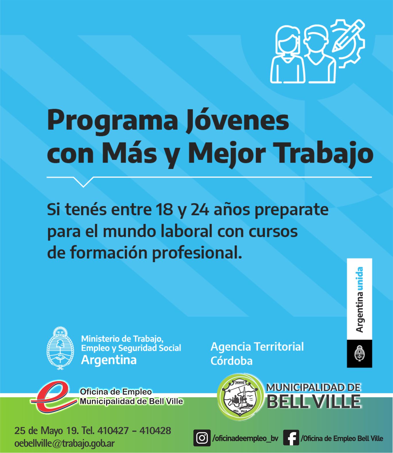 Los interesados deberán dirigirse a la Oficina de Empleo de la Municipalidad, 25 de Mayo 19,  TE: 03537- 410427/ 410428, Mail: oebellville@trabajo.gob.ar – Facebook: Oficina de Empleo Bell Ville