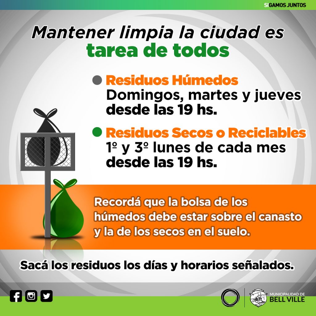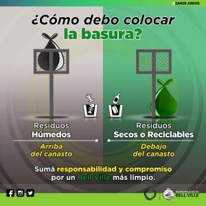 En el caso de residuos de jardinería, éstos deben estar embolsados y son retirados de acuerdo al lugar de residencia del frentista. Los días de recolección y las zonas, están publicados en la web municipal (bellville.gob.ar) botón “Días y horarios-Recolección de Residuos”.