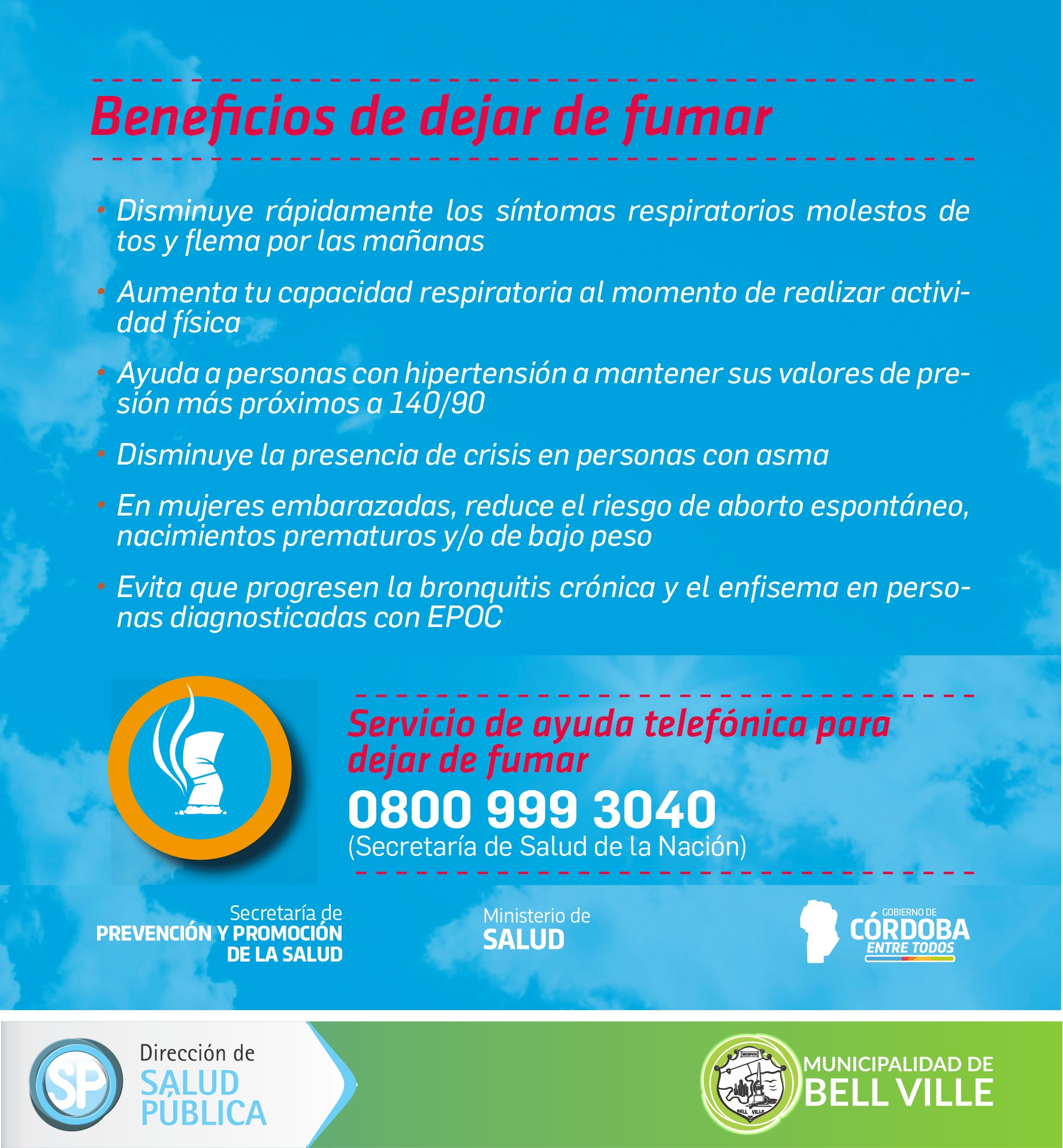 El Ministerio de Salud de la provincia de Córdoba informa que según la última Encuesta Nacional de Factores de Riesgo (2018), en Argentina la prevalencia de consumo de tabaco (cigarrillos), en personas mayores a 18 años, alcanzó el 22,2 por ciento. Mientras que en nuestra provincia la cifra resultó más elevada con diferencias significativas respecto al total nacional: 26,7 por ciento.