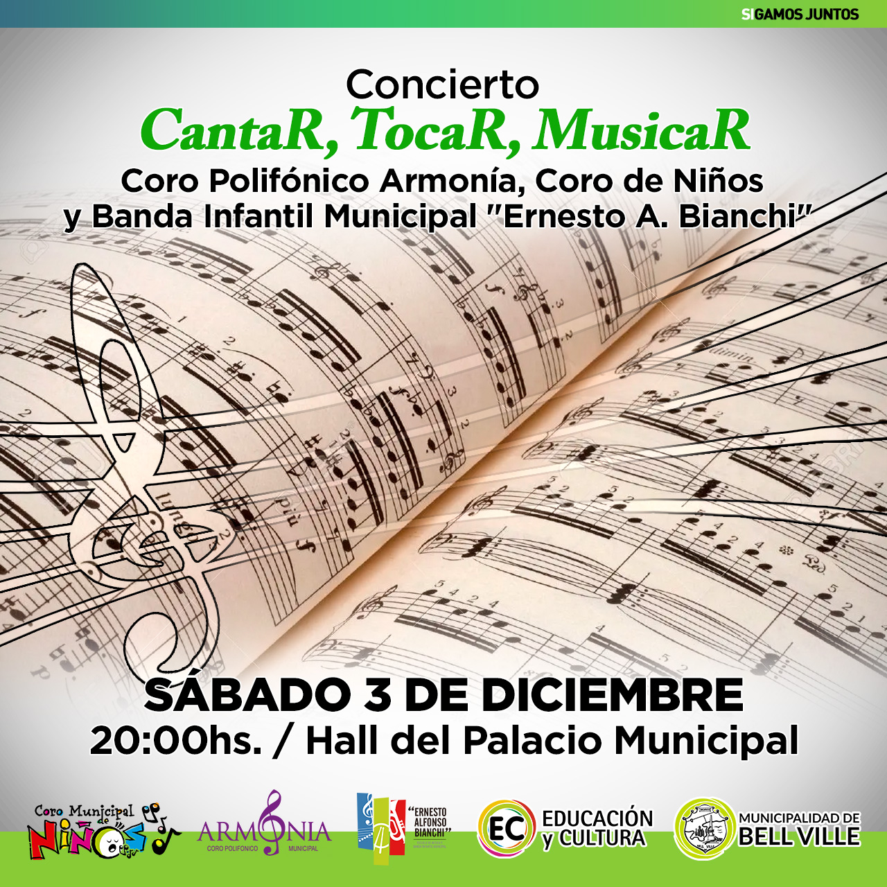 Este sábado, en el hall del edificio municipal, a partir de las 20:00, los Coros de Niños y Armonía, como así también la Escuela de Música y Banda Infantil Ernesto Alfonso Bianchi, ofrecerán un concierto como cierre de la actividad anual de los tres grupos municipales.