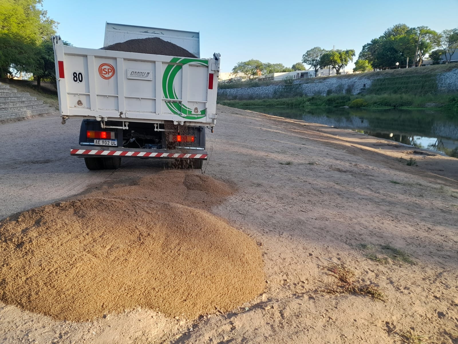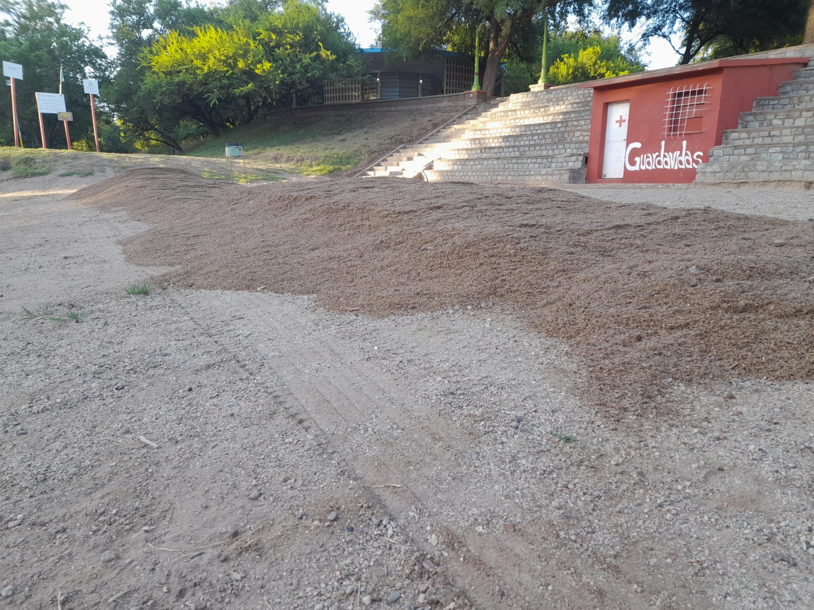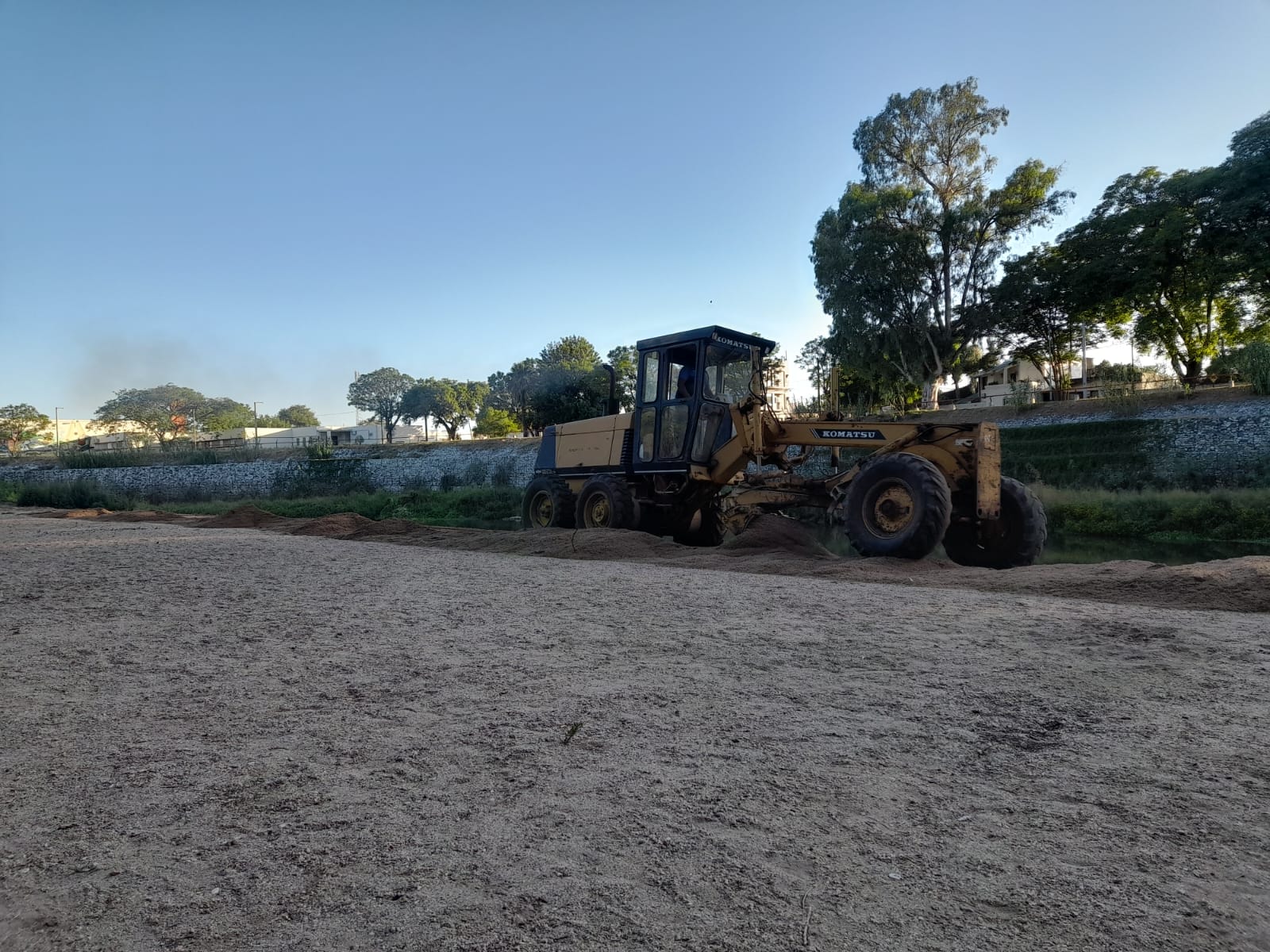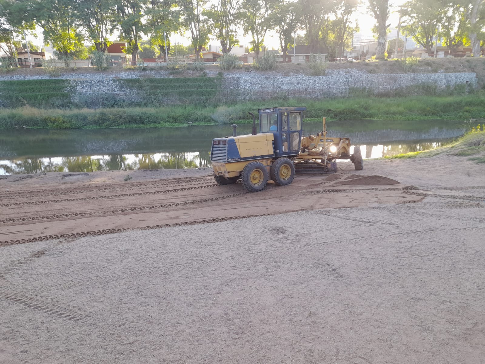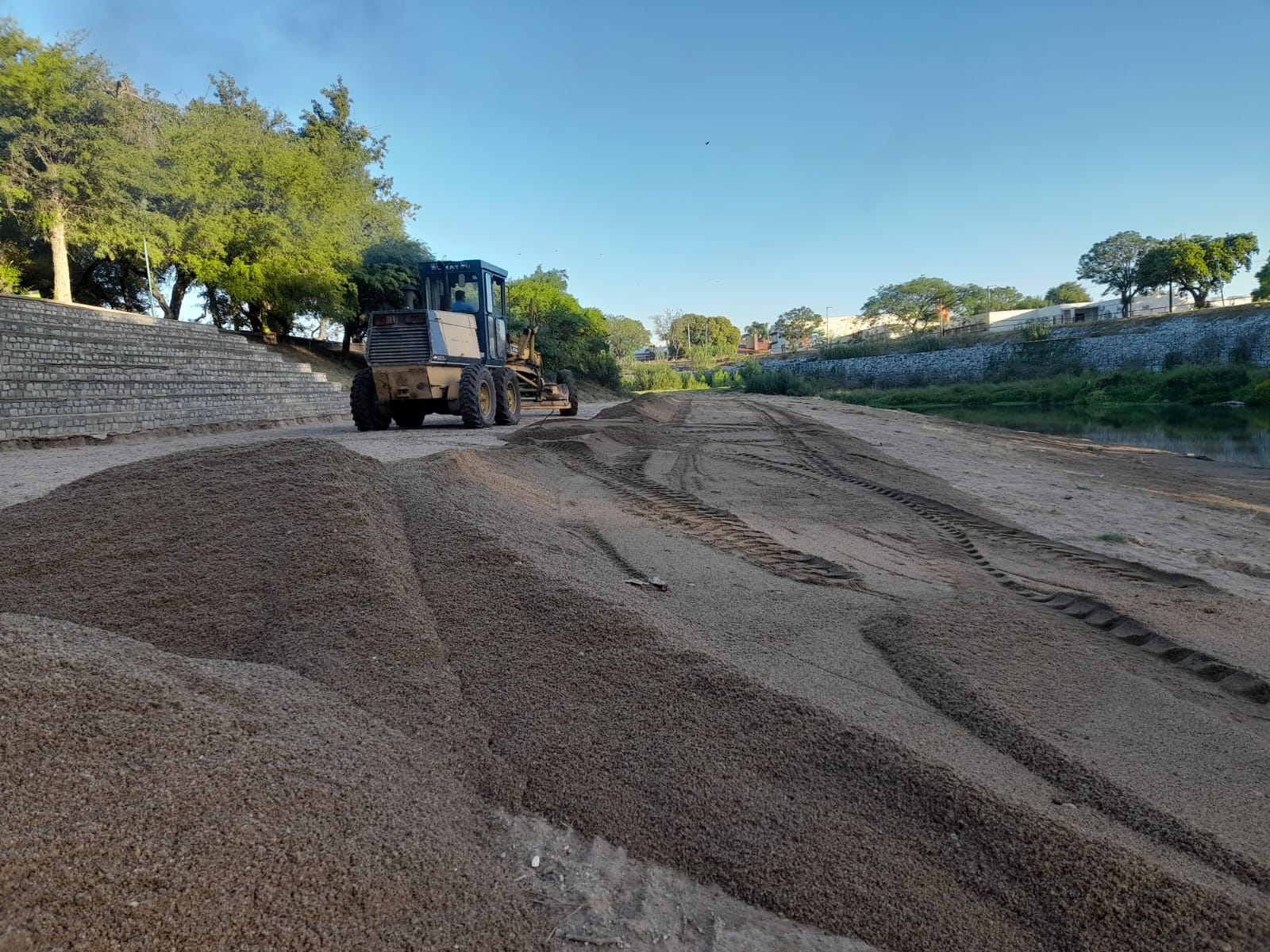 Tres camiones volcadores distribuyeron arena, utilizándose para esa tarea una motoniveladora y una retroexcavadora.