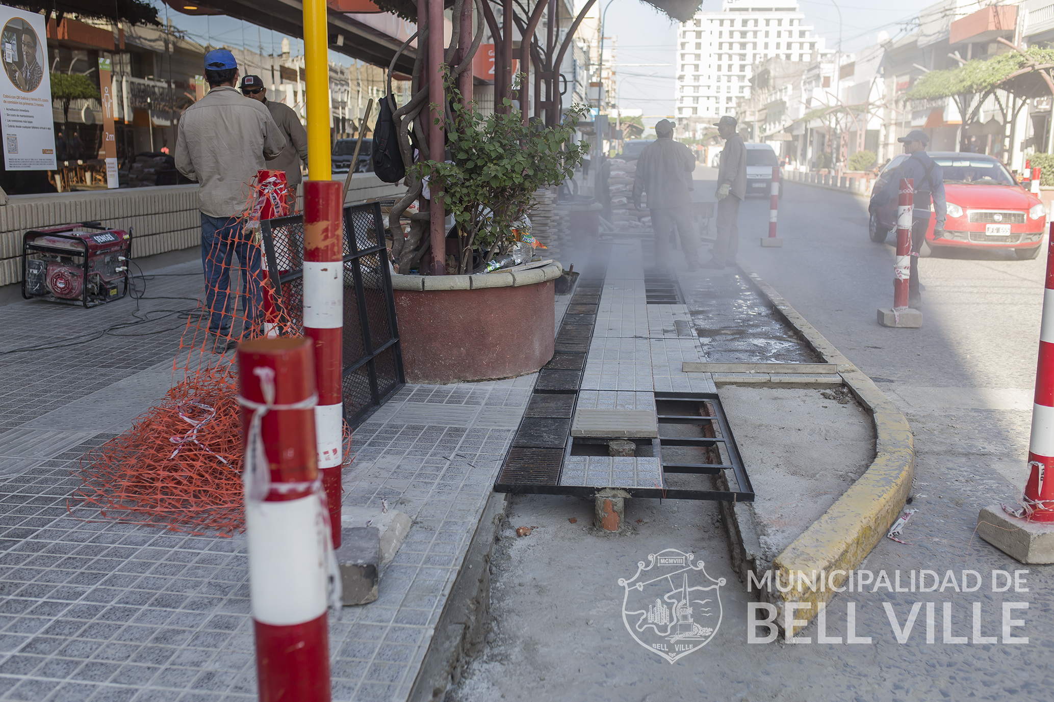 Luego de la paralización de obra solicitada por la entidad que nuclea a los comerciantes locales por las tradicionales fiestas de fin de año, se han dado comienzo nuevamente a los trabajos, continuando con el recambio de las rejillas pluviales y colocación de pilonas, manteniendo la misma estética que la cuadra ya intervenida, entre Belgrano-Pellegrini e Int. Viqueira.