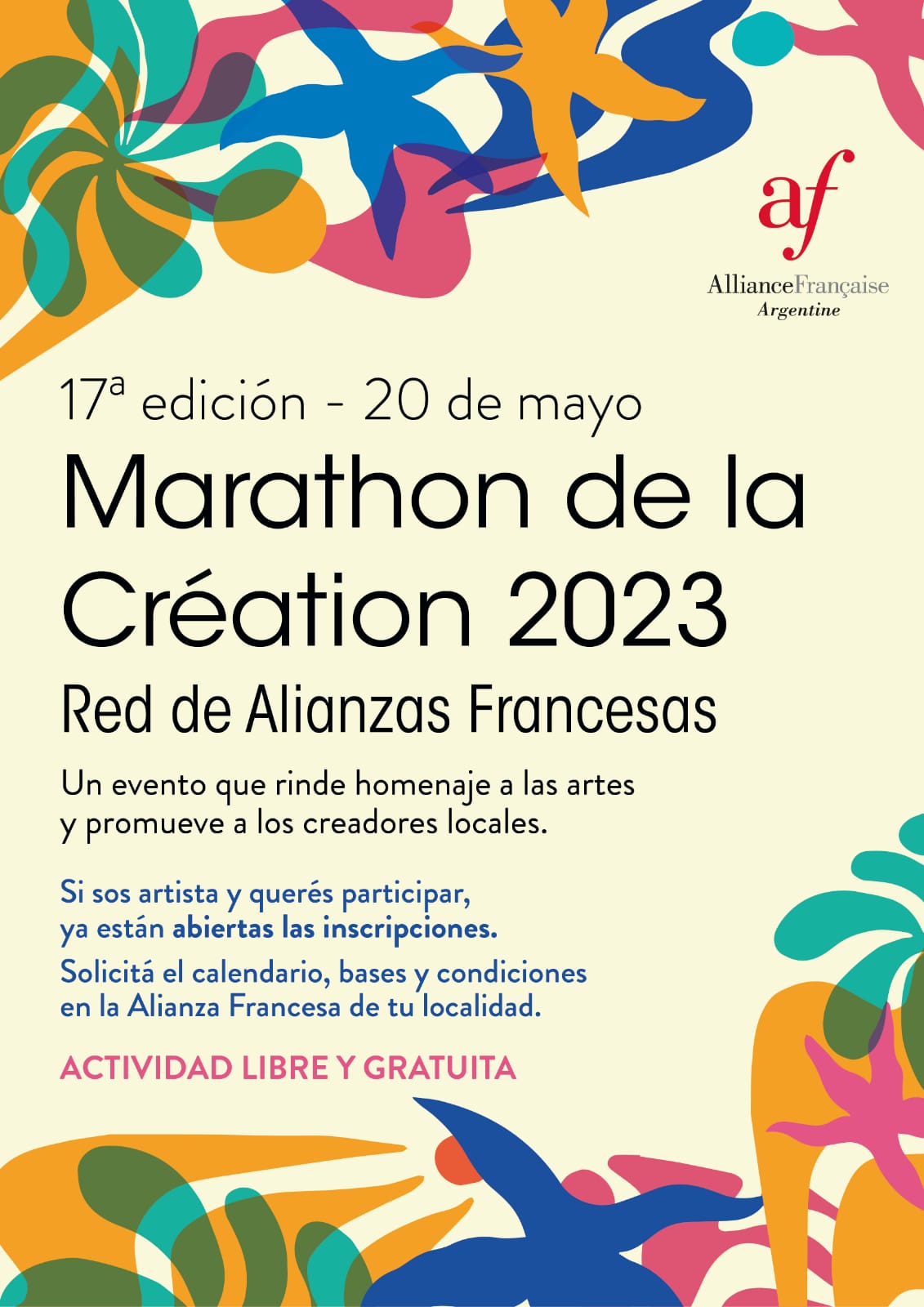 Este sábado 20, de 14:30 a 19:30, en la sede de la Alianza Francesa local, Gral. Paz 224, se llevará a cabo la Maratón de la Creación que anualmente estas instituciones diseminadas en el país realizan en homenaje  a las artes y fomentan el talento de la creatividad local en Bordado, Cine, Pintura, Teatro individual, Artesanías, Danza, Cocina, Diseño gráfico, Teatro grupal, Diseño de indumentaria, Canto individual, Música instrumental, Canto coral, Tejido, Escultura, Fotografía, Escritura y Dibujo, entre otros.
