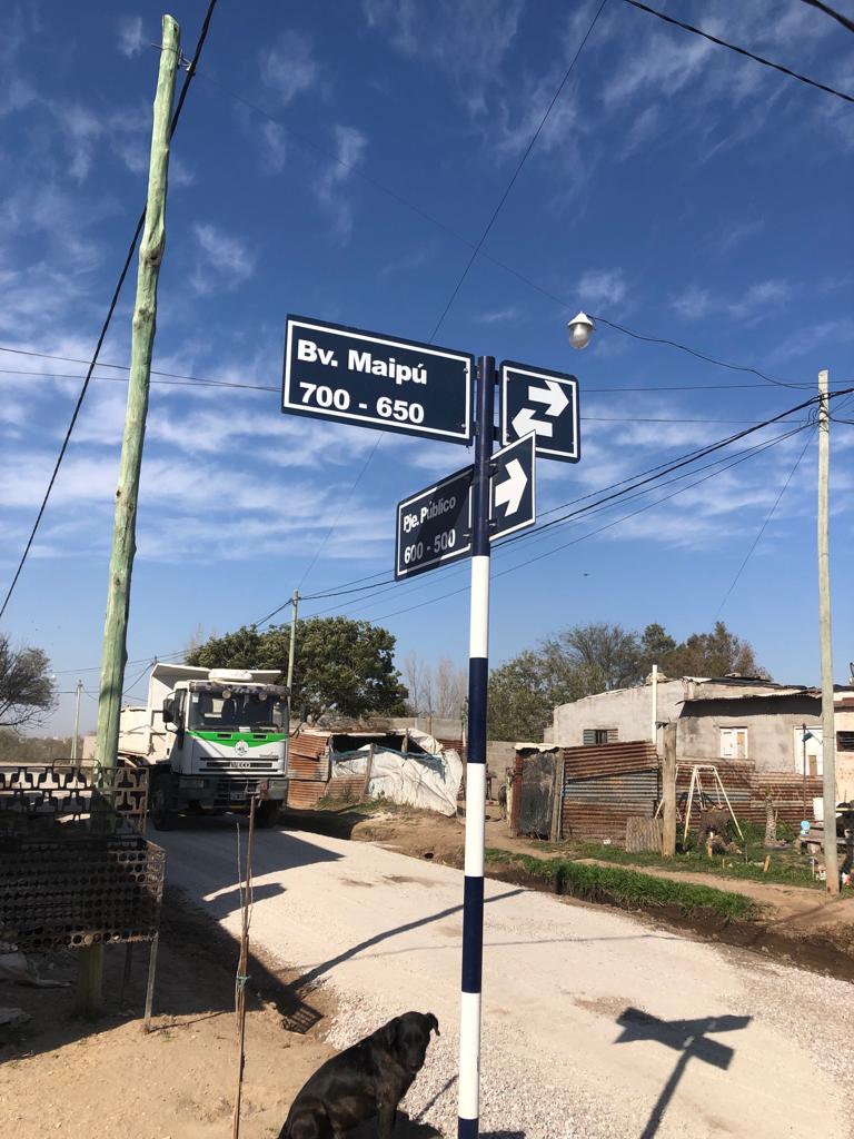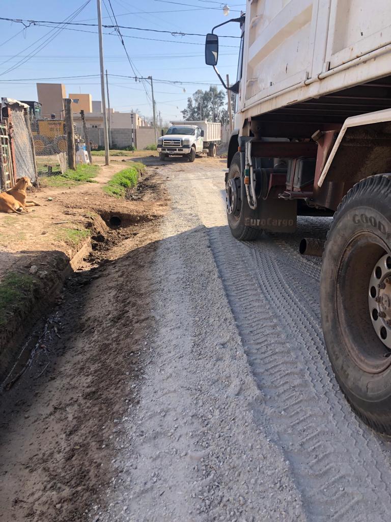 Personal y maquinarias del municipio, trabajan en el nivelado e incorporación de áridos en bulevar Maipú y calles de tierra cercanas.