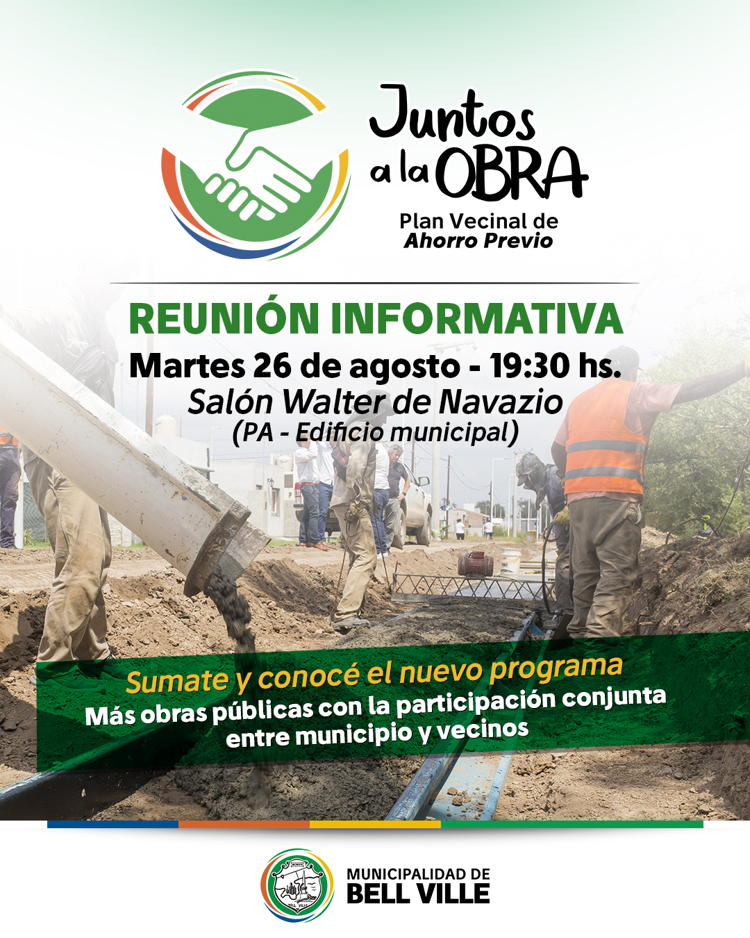 El municipio convoca a referentes de centros vecinales y a la ciudadanía en general a una reunión informativa sobre el Plan Vecinal de Ahorro Previo “Juntos a la Obra”.