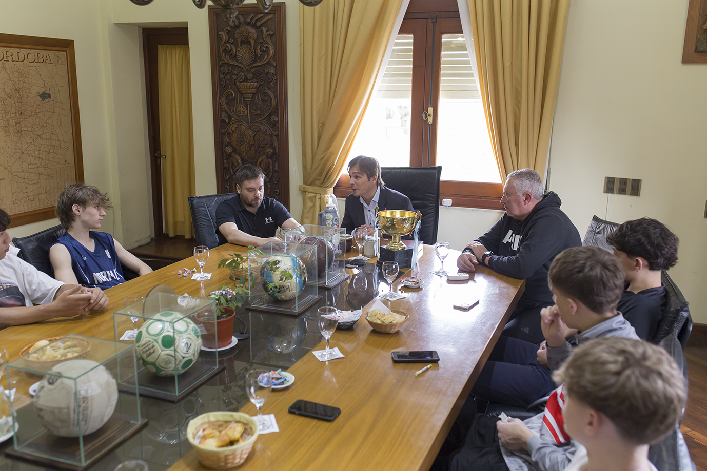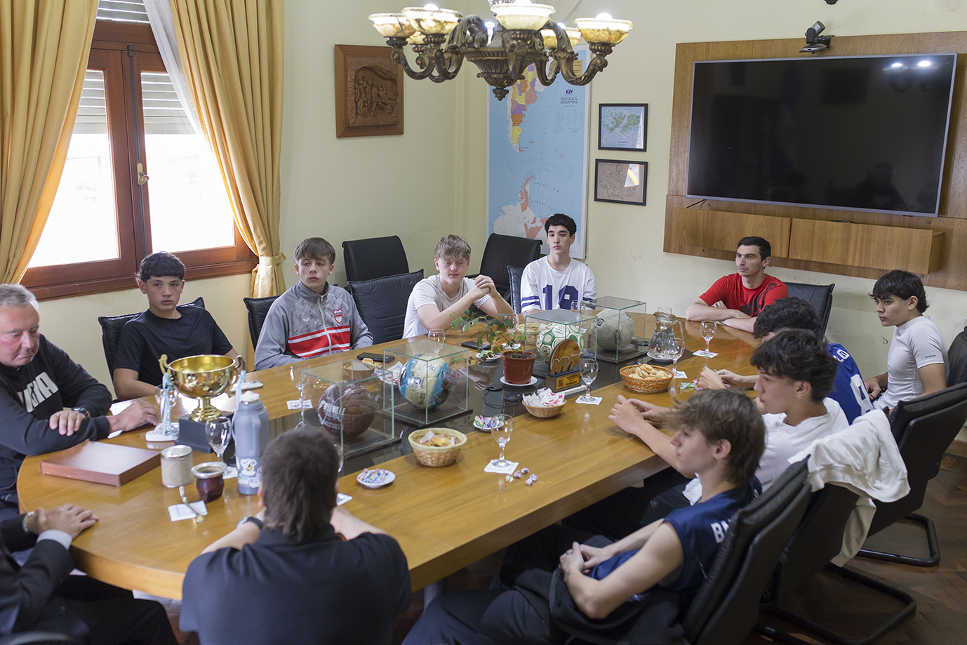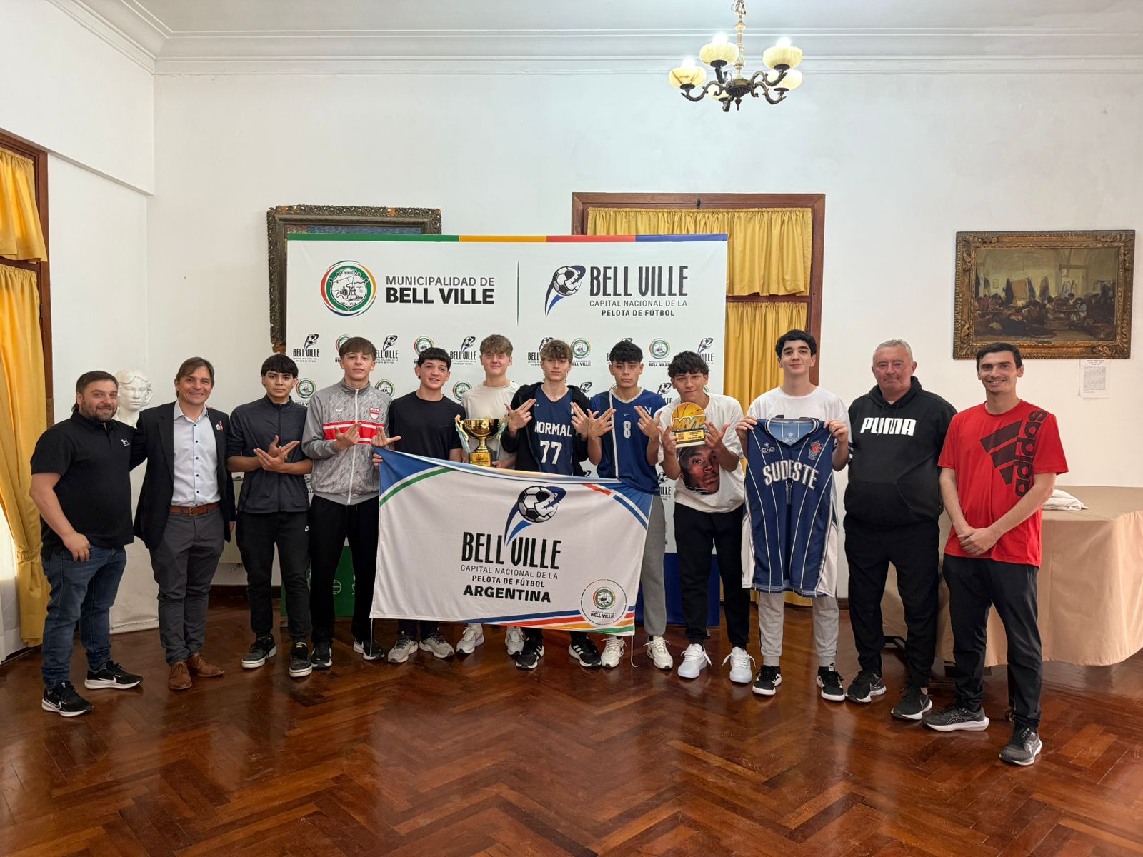 Luego del trascendente evento realizado en el Club San Vicente, el intendente Juan Manuel Moroni recibió en la Municipalidad a un grupo de jugadores bellvillenses del plantel para celebrar su logro. Acompañados por el entrenador Lucas Ferrero, los chicos mostraron orgullosos los trofeos obtenidos.