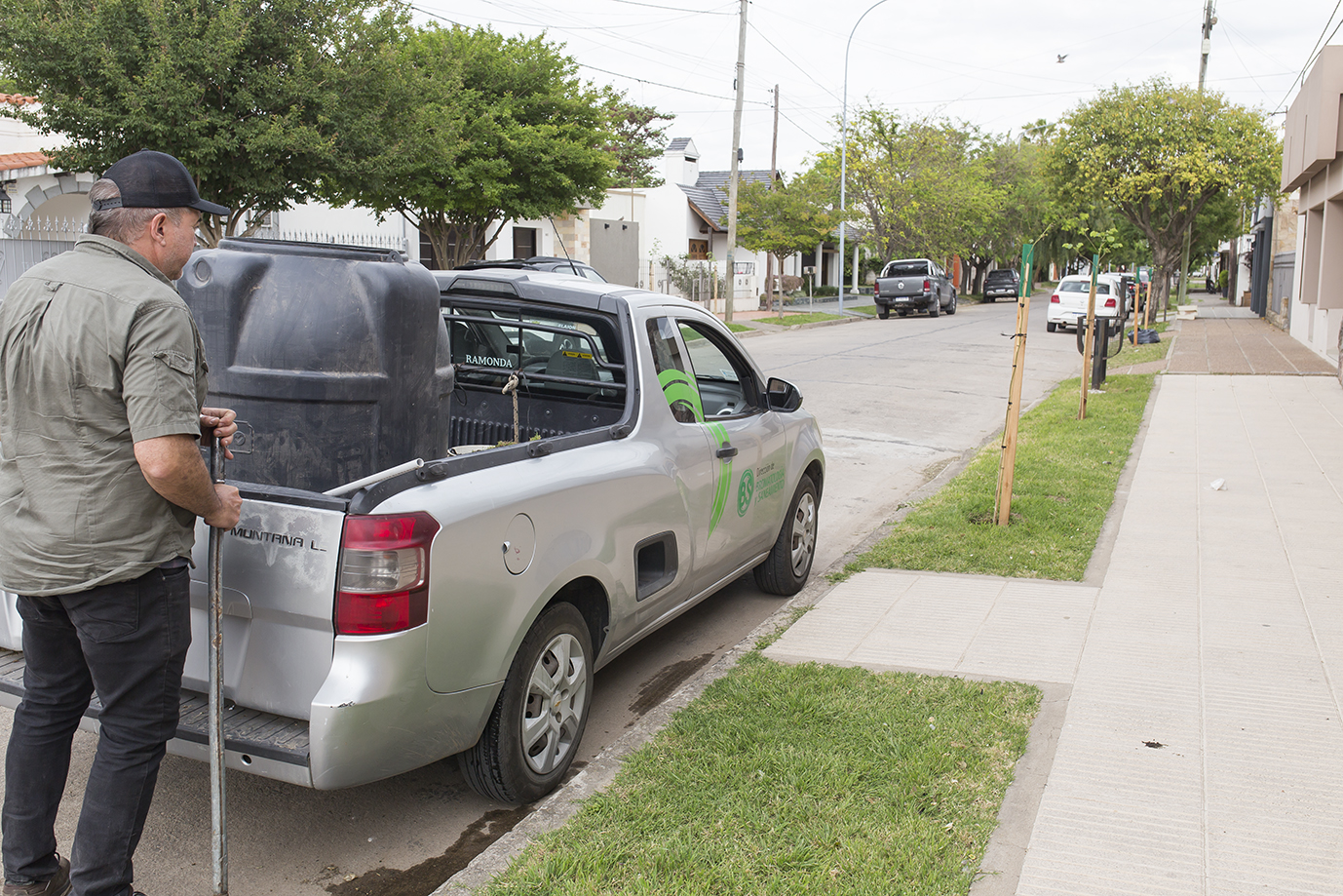 Personal del área de Bromatología y Saneamiento del municipio está plantando árboles en veredas y espacios verdes de distintos puntos de la ciudad.