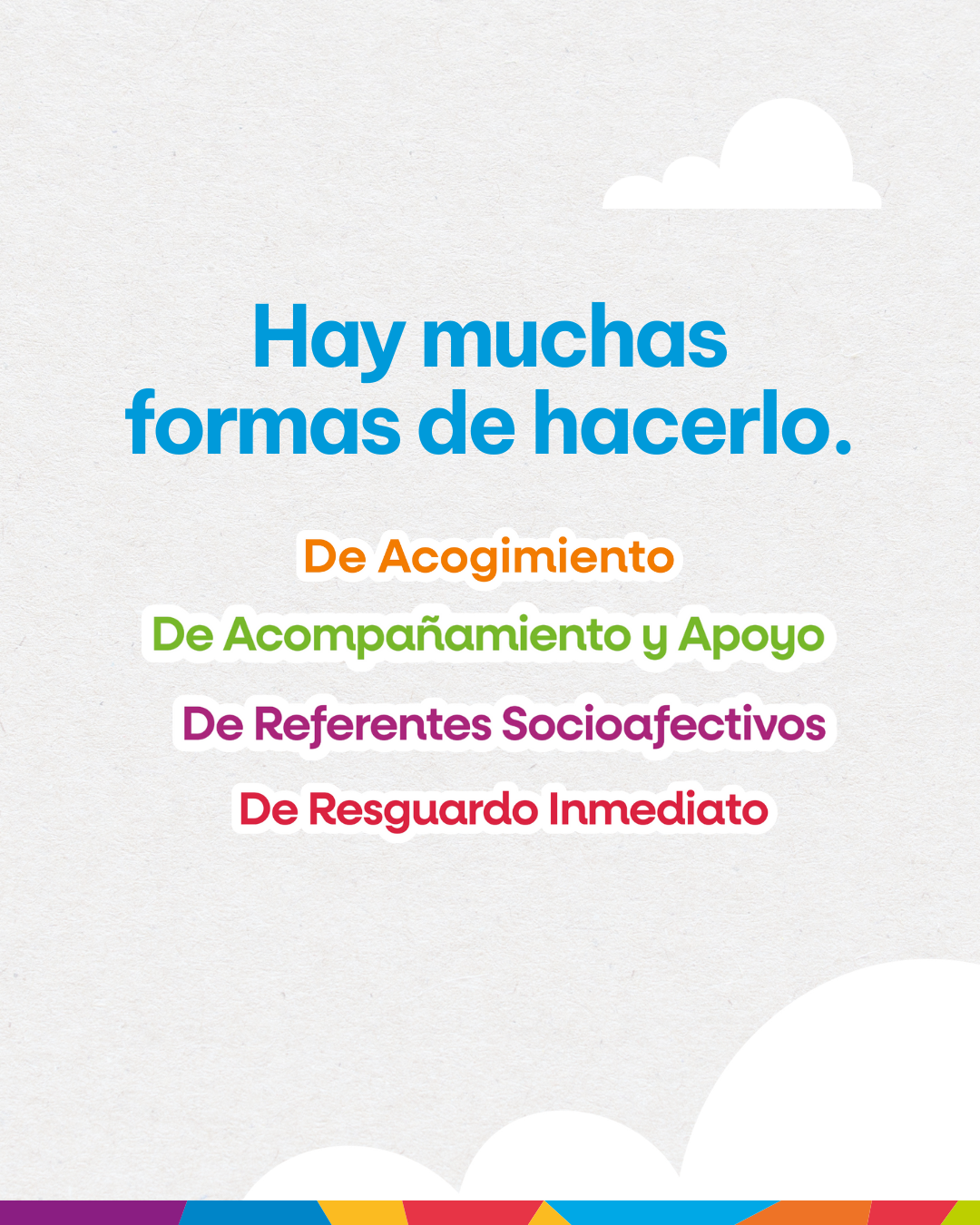 - “Familias para familias”: brindan un hogar temporal a niñas, niños y adolescentes que, por distintas circunstancias, están separados de su familia de origen. Asumen su cuidado mientras se resuelven los motivos que llevaron a la separación del entorno familiar.