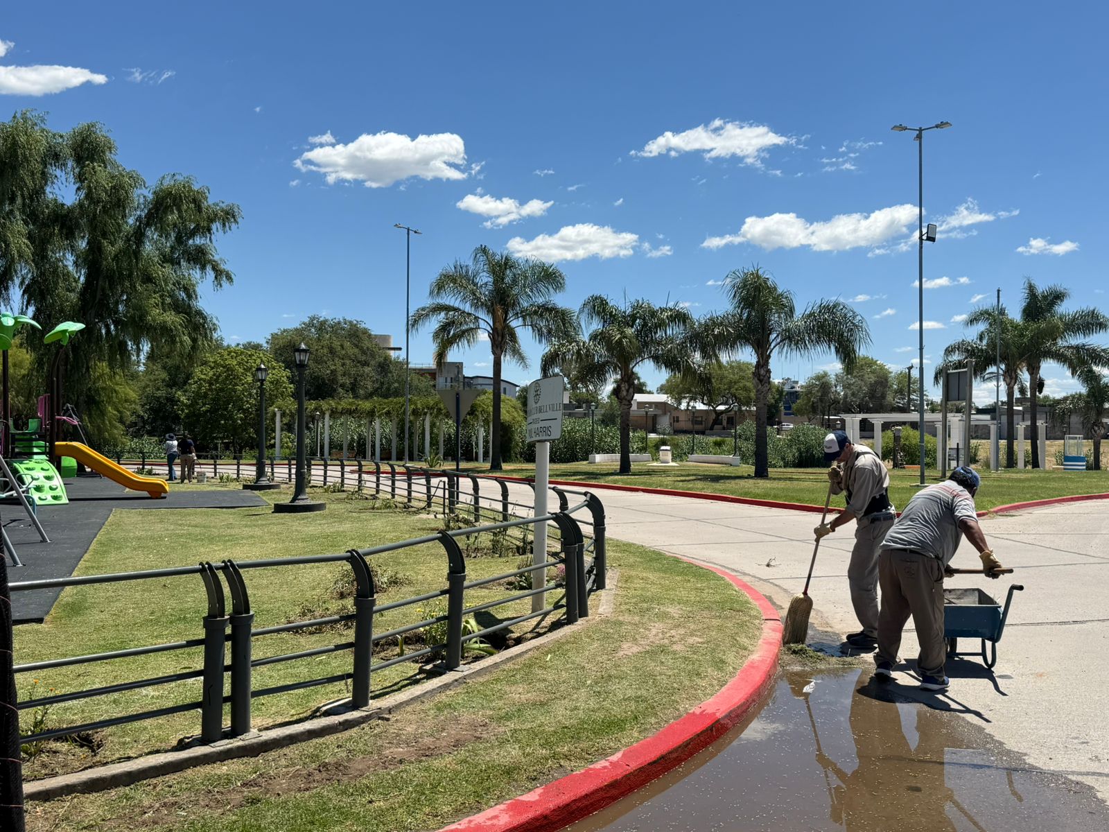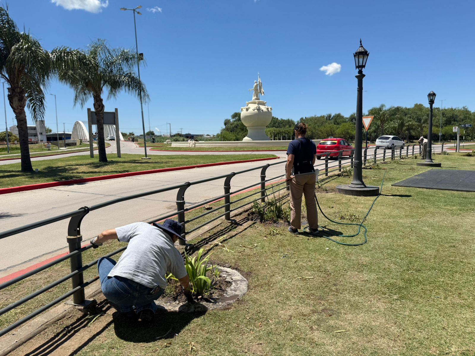 Se avanza con la puesta en valor del Paseo de la Reconstrucción, con trabajos de paisajismo y mejora de espacios verdes a cargo de personal municipal, mientras que una empresa contratada ejecuta tareas de consolidación en la calle Junín.