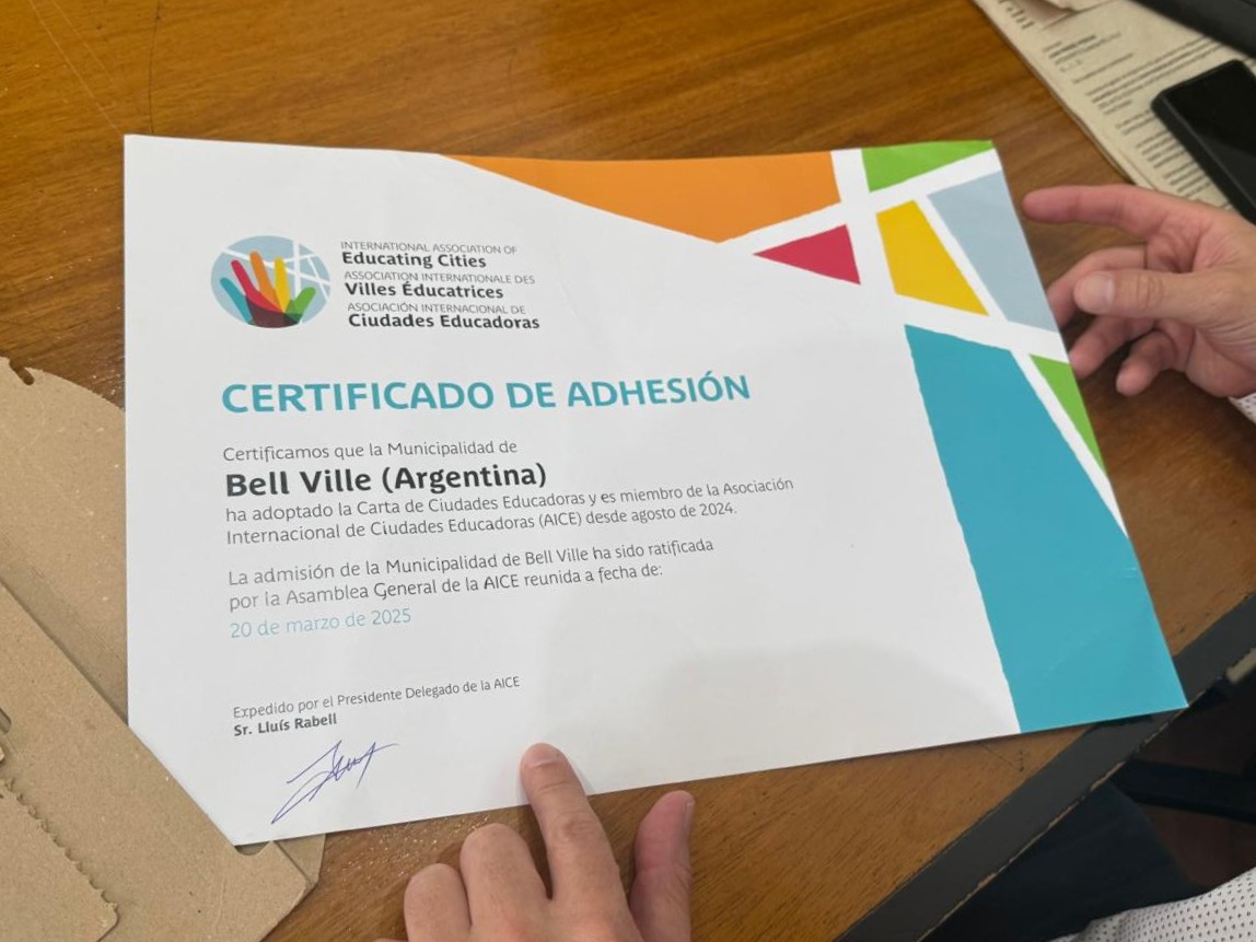 La Municipalidad de Bell Ville recibió desde Barcelona el certificado oficial emitido por la Asociación Internacional de Ciudades Educadoras (AICE), que acredita formalmente a la ciudad como integrante de la Red de Ciudades Educadoras y la adhesión a la Carta de Ciudades Educadoras.