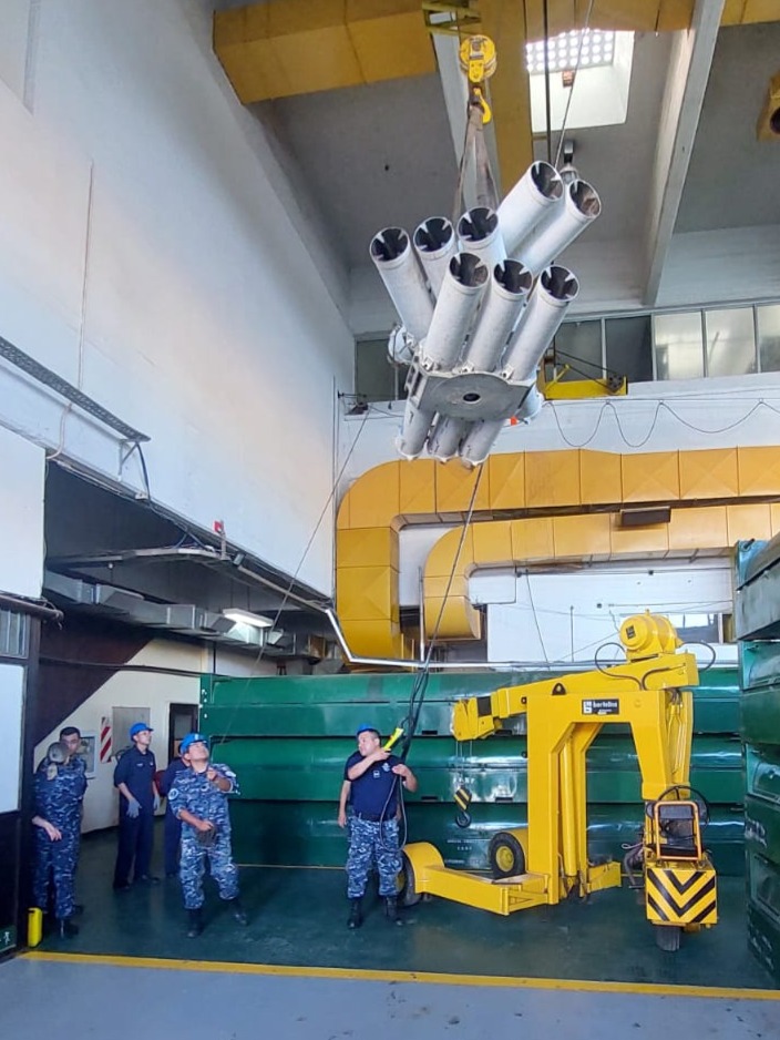 Se trata de un lanzador de chaff de la corbeta A.R.A. Guerrico, que entró en acción el 2 de abril de 1982, cuando se usó para desembarcar tropas en el operativo para recuperar las islas Georgias del Sur. El dispositivo lanza señuelos para que los misiles no impacten en sus objetivos.