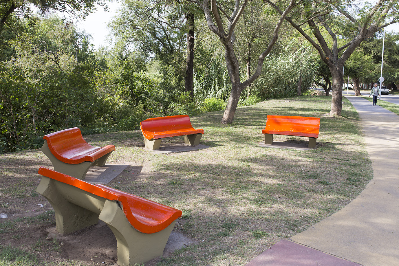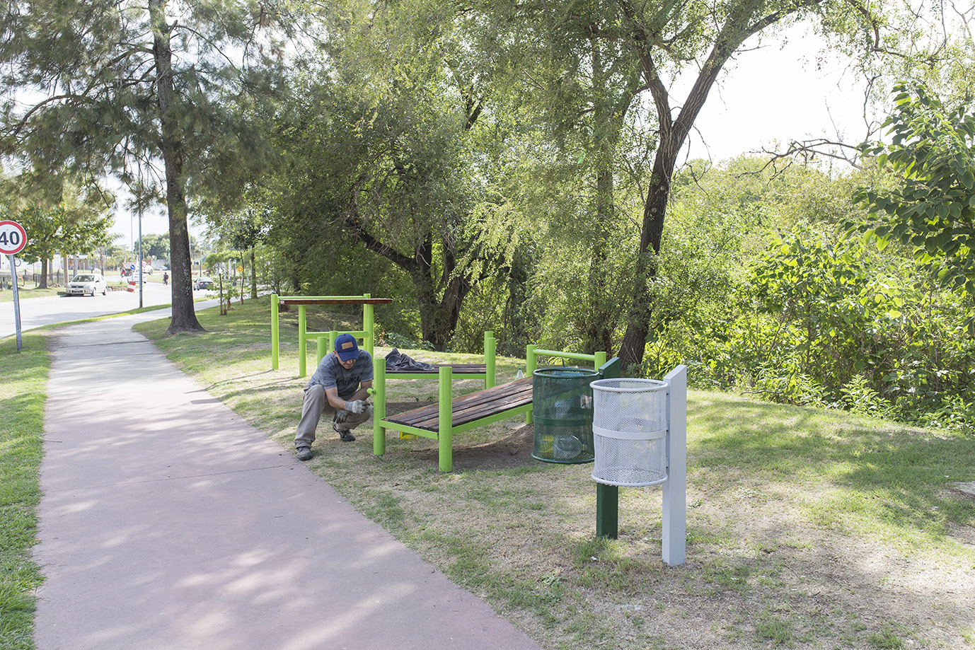 Asimismo, en cercanías del Puente de la Historia, arregló y pintó los aparatos para hacer ejercicio y los bancos que están sobre la costanera, y sigue con las tareas de para adoquinar la calle Junín.