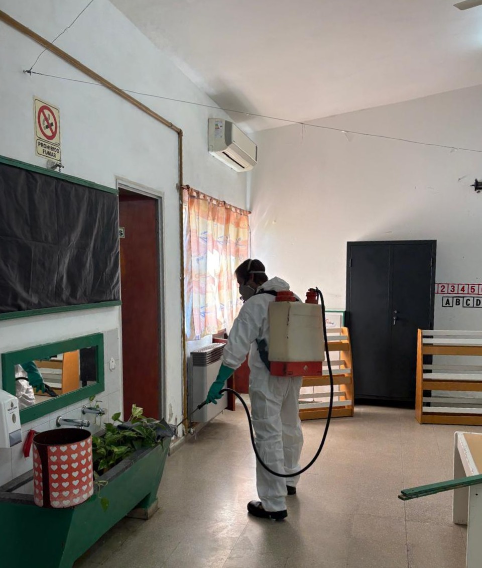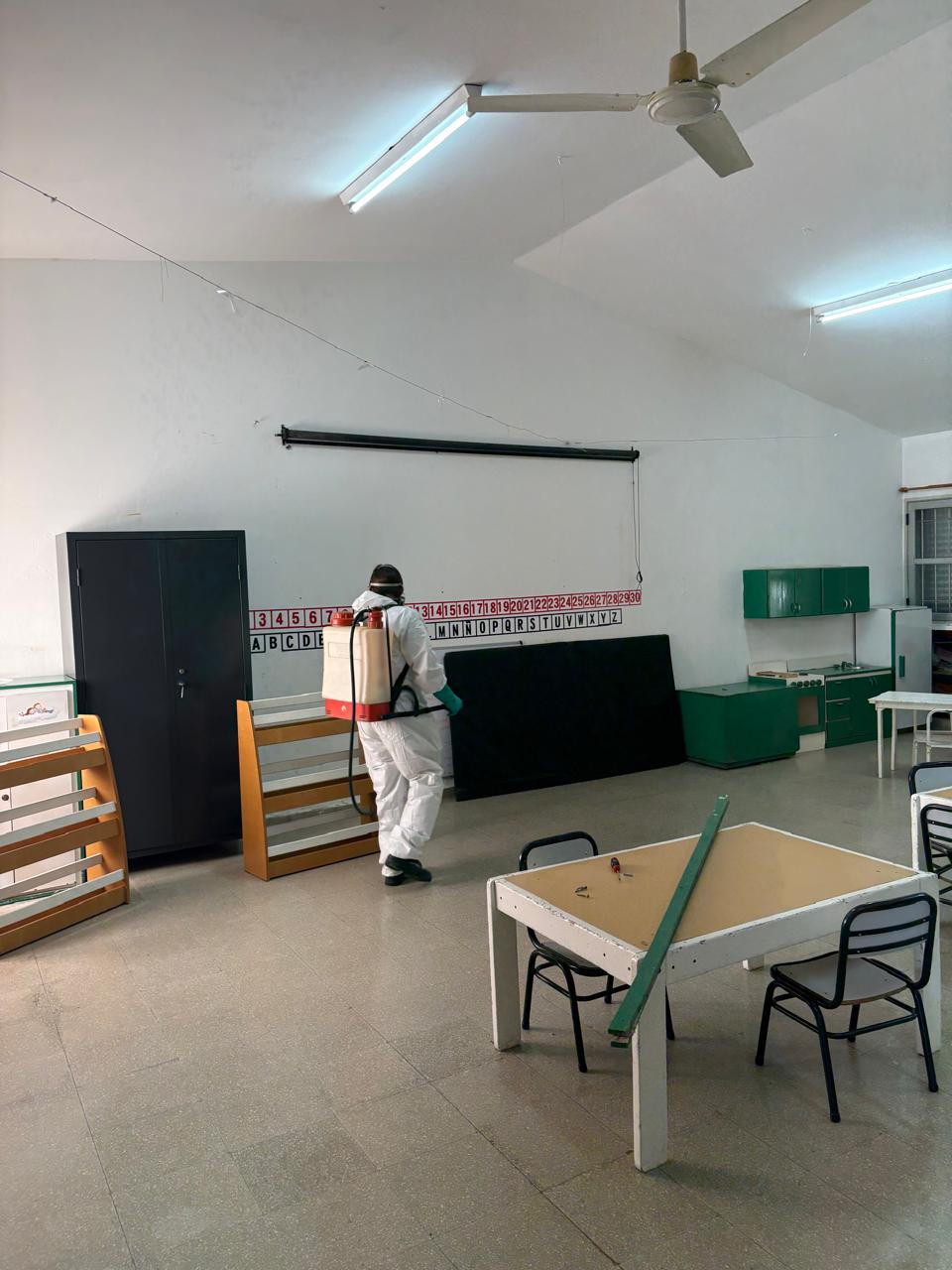Durante febrero llevó adelante desinsectaciones en distintos establecimientos con el objetivo de prevenir la proliferación de insectos rastreros y voladores. Los trabajos comprenden la aplicación de tratamientos preventivos mediante rociado perimetral, tanto en espacios interiores como exteriores de las escuelas públicas.