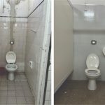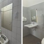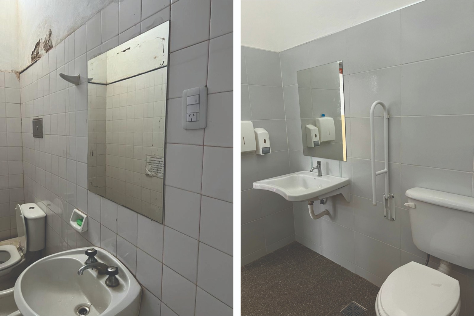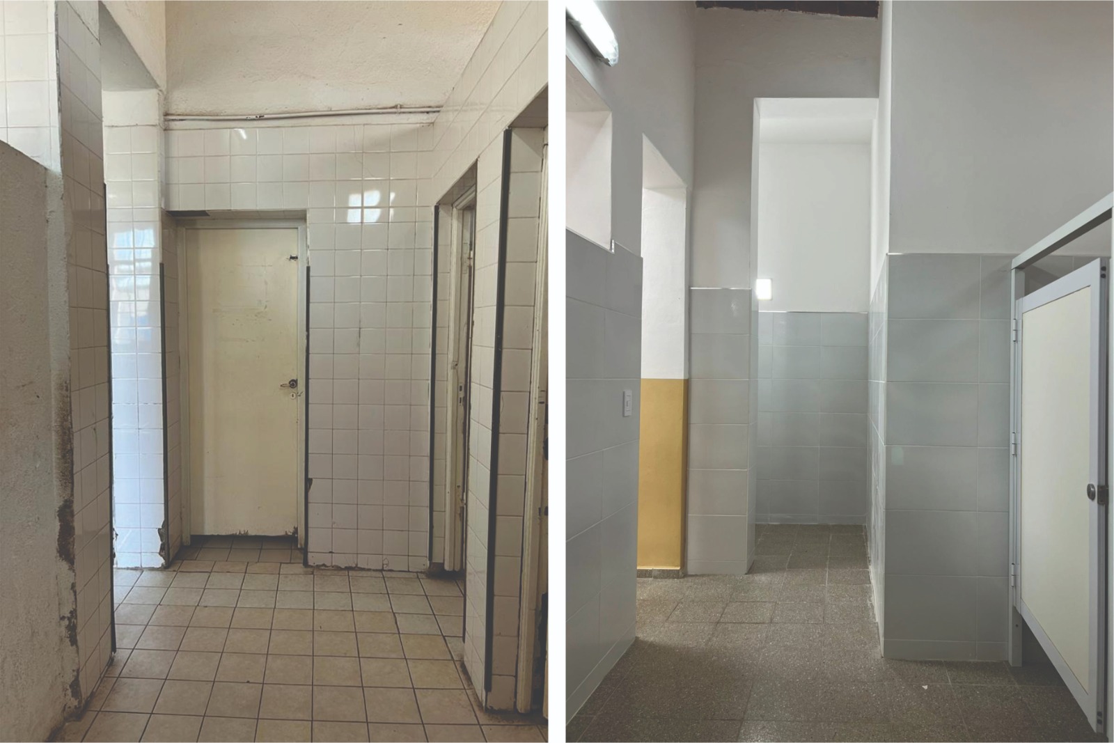 La intervención abarcó la renovación completa de revestimientos cerámicos; la instalación de artefactos sanitarios; la colocación de mesadas y bachas y la ejecución de tareas de pintura general.