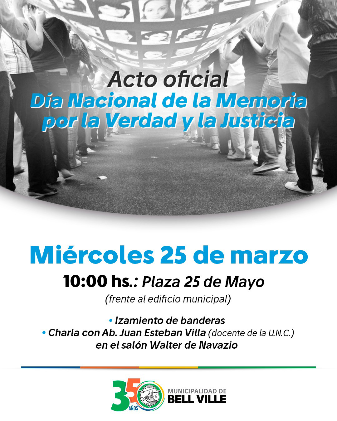 A 50 años del golpe militar del 24 de marzo de 1976, el miércoles 25 de marzo será el un acto con abanderados e izamiento de banderas por el Día Nacional de la Memoria por la Verdad y la Justicia en la explanada de la Municipalidad.