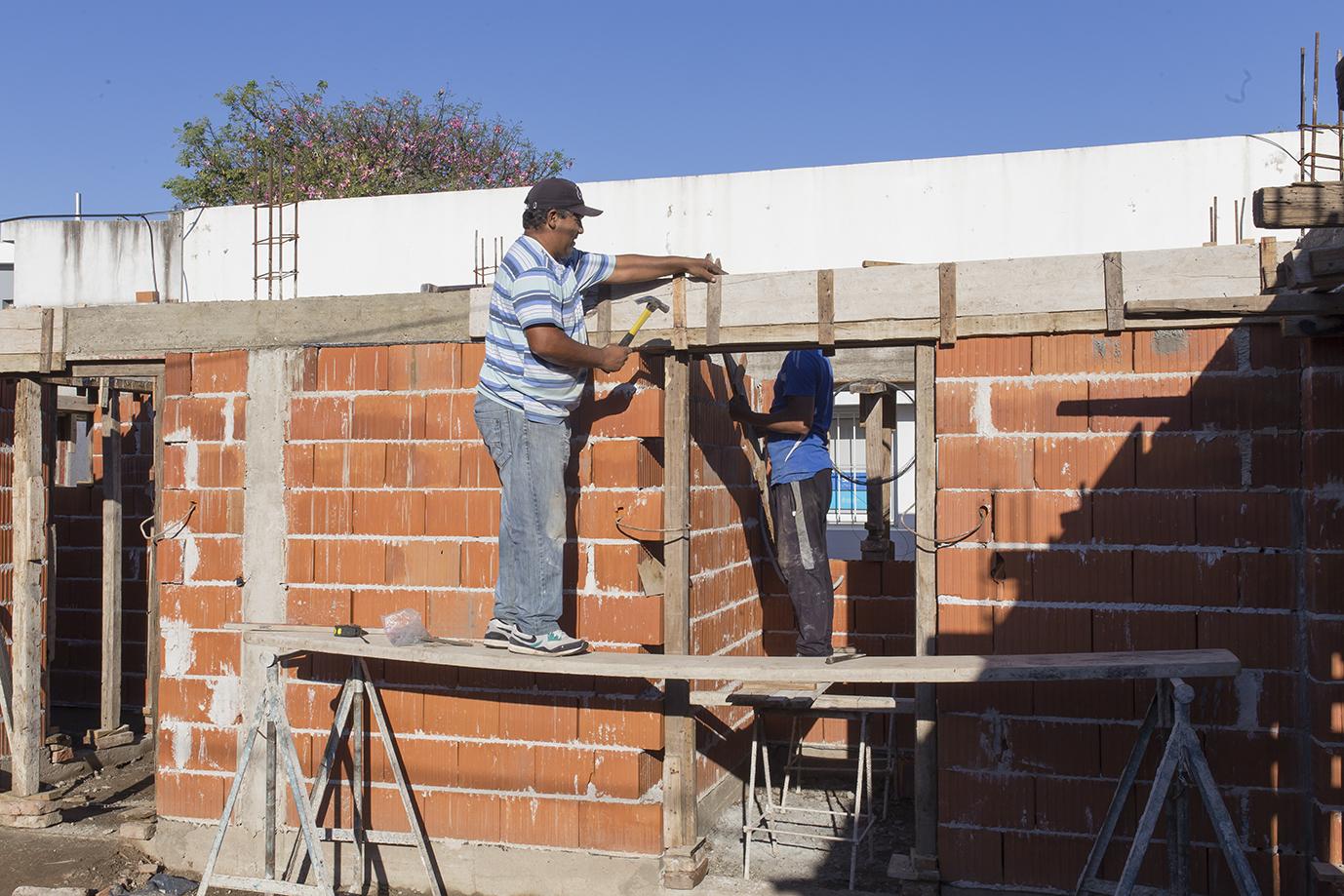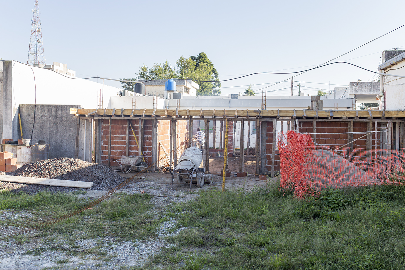 Hasta la fecha se hizo cimentación y mampostería hasta altura de dintel. También se completó el alero perimetral en hormigón visto con sus respectivas cajas para futuras luminarias y se realizaron instalaciones cloacales primarias.