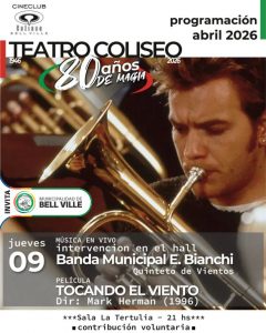 La Banda Municipal Ernesto Alfonso Bianchi tendrá una participación especial este jueves 9 de abril, a las 21:00, en el inicio del ciclo “80 años de magia” organizado por el Cineclub Coliseo en el marco del 80° aniversario del teatro.