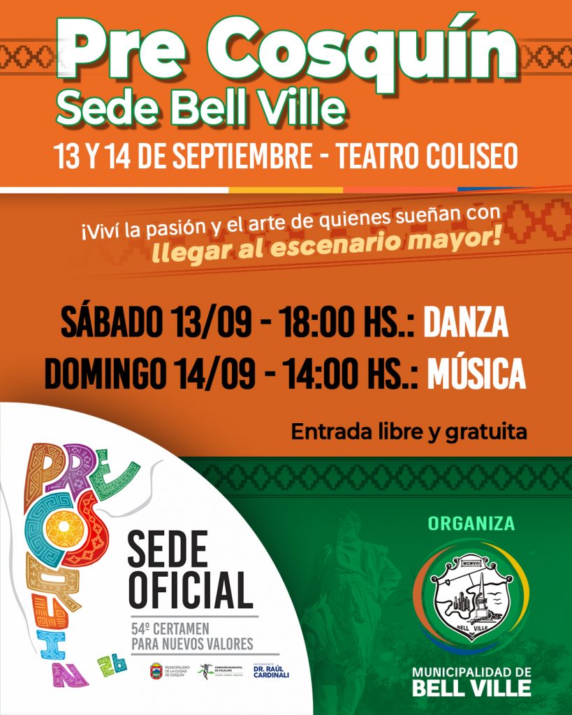 Por primera vez, nuestra ciudad será anfitriona de una de las instancias más importantes del folklore nacional. El 13 y 14 de septiembre, el Teatro Coliseo recibirá a artistas de todo el país en el marco del Pre Cosquín 2025 en los rubros habilitados, jerarquizando el escenario cultural local y posicionando a Bell Ville como un punto de referencia en el circuito artístico argentino.